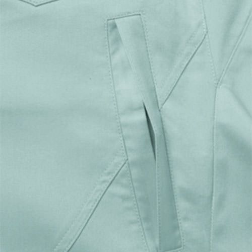 ストレッチ性を付与した制電対応綿素材 ストレッチ素材を活かし、定番スタイルながら野暮ったさを払拭、制電糸を使用し、大型ポケットを設けることで多様な用途に対応