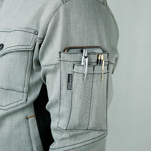 「しっかりした生地の作業服が欲しい!」という声から、丈夫な生地で作られた現場に特化した作業服!さらに肩と袖にステッチを入れることで補強も完璧。