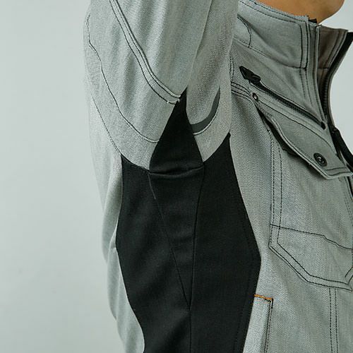 世界を席巻するナイロンスパンデックス素材が更なるボリュームアップを実現。近未来系ワークウェア、ここに極まる。 ・アウトドアやスポーツシーンで幅広く使用されている高性能ナイロンストレッチ素材を、よりハードワーク仕様に改良したヘビーディーティーユースモデル。特殊な織り構造により、従来商品に比べ生地の大幅な目付アップを実現。デザインも一新しハードワーカー様等幅広い業種に対応可能。・細番手のナイロン糸を高密度に織り込む事で高い堅牢性を実現。素材裏面は点接触構造で高級感溢れる着用感。・現在のスポーツ業界で主流となっているタテ方向の伸びを強調(伸長率タテ約42%、ヨコ約23%)した全方位ストレッチで、驚異の動き易さを実現(伸長回復率は1時間後タテ約88%、ヨコ約80%)。・生地の性能だけでなく、3Dパターンを取り入れ更なる動き易さアップ。・プラスティック製のファスナー、金属製のドット釦等は国産YKK社製を使用。細部にまで品質に拘っています。