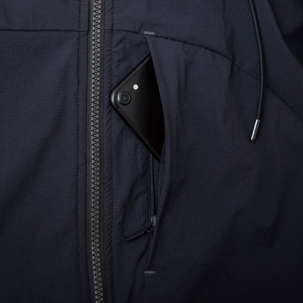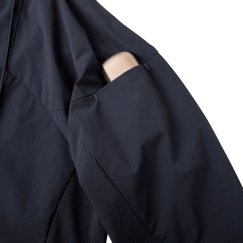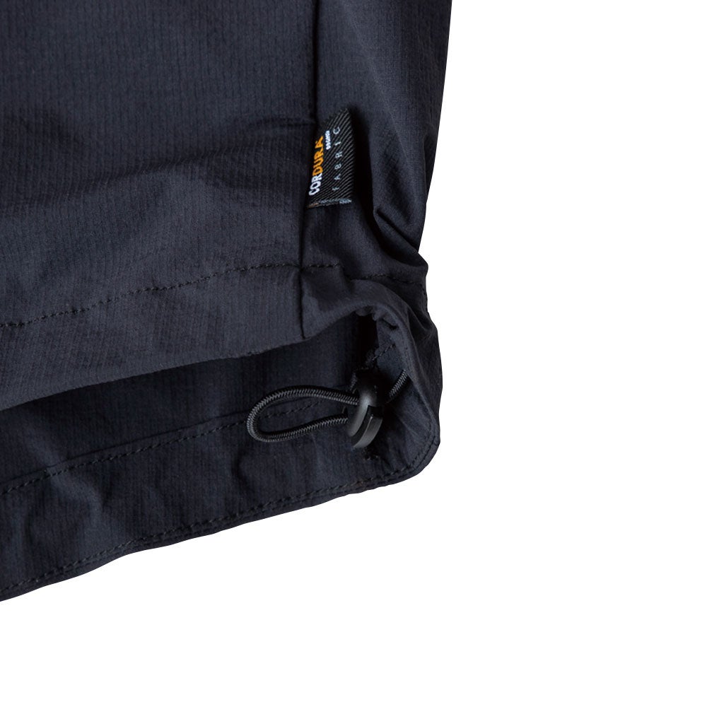 CORDURA×2WAYストレッチフーディー。ドローコード・袖口アジャスト付きで機能性と着心地を両立。