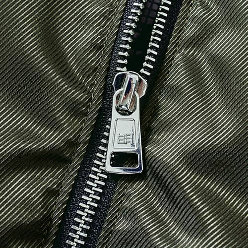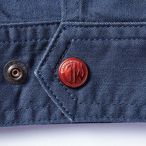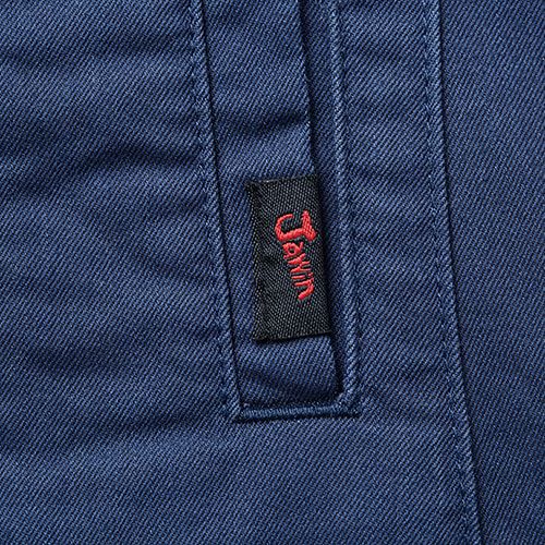 インパクト抜群のカモフラファスナーとレッドパイピング 高級感のある光沢を出した変わり織り素材とカモフラ柄のファスナー、レッドパイピング、オリジナルワッペンがJawinらしさを醸し出すカジュアルティストワークウェア