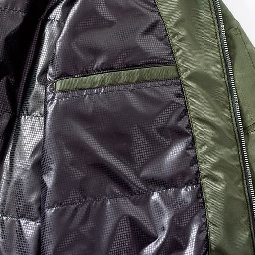 暖かくて軽量。特殊な縫製方法で立体感、ふくらみ感を出したこれからのマストアイテム! TUFLEX(タフレックス)極細ポリエステル繊維を使用し、高密度に織り上げ、透湿防水を実現した快適素材です。ノンコーティングでありながら防水性と撥水性に優れ、なおかつソフトな風合いを併せ持っています。Thermotron RediPoka(サーモトロンラジポカ)太陽光の熱エネルギーと遠赤外線の相乗効果で、高い保温効果を発揮する素材です。「吸光熱変換機能剤」と「遠赤外線放射機能剤」を1本のフィラメント内に融合することで、太陽光を吸収・熱変換し、同時にその熱で「遠赤外線放射機能材」を積極的にあたためることにより遠赤外線放射をさらにアップ。気温が低い時でも、快適なあたたかさを提供します。MEGANA(メガーナ)独自の複合紡糸技術から生まれた、高性能導電性繊維を使用することで物理的に帯電を防止し、空気が乾燥した状態でも十分な制電効果を発揮。高強力ポリエステルとしての強度、軽量性を持ちながら、静電気による悪影響を解消することにより、集中力やスタミナの持続などの効果が期待できます。耐摩擦性にも優れた上、繰り返しの洗濯による性能の低下はほとんどありません。