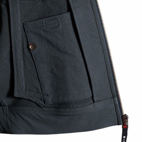ジャケットの衿は防風性アップとオリジナル性を主張するスイングトップタイプ胸ポケットはマチ付きラウンドフロント仕様を取り入れファスナーの開閉もスムーズです。裾丈もややショートにしスタイリッシュ