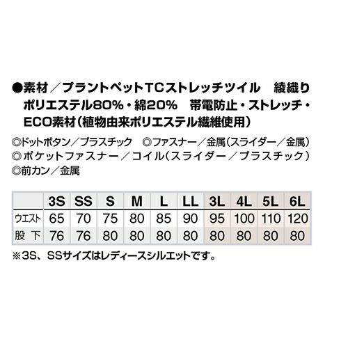 バイオエコTC素材のエコマーク対応商品。植物由来のサスティナブル素材、帝人フロンティア「プラントペットRストレッチ」を採用。ウエスト部分はサイドリブ仕様になっており、圧迫感を軽減します。