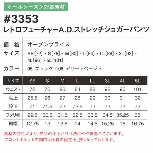 他の画像を見る 作業服 カーゴパンツ アイズフロンティア I'Z FRONTIER A.D.ジョガーパンツ #3353 作業着 通年 秋冬 寒さ対策 アウトドア スポーツ カッコいい 動きやすい 黒 ブラック ベージュ キャンプ 釣り カジュアル 20代 30代 40代 特別価格 ¥ 5,379 税込 時代に流されないレトロテイストを現代風に鮮やかにアップデート! ・ニット素材を思わせるストレスフリーの柔らかな着心地ながらも、布帛素材ならではの屈強な堅牢性を誇るアルティメットワーキング素材を採用。・高品質な二重織構造。素材表面は細番手デニール糸を高密度で織りあげることにより、独特なマット冠を表現したリッチ感の溢れる存在感を発揮。素材裏面のローロフトパイル構造によるしなやかな風合いが、極上の着心地と衣服内の適度な保温性を実現します。・伸長率縦約28%、横約16%、伸長回復率(1時間後)約90%の適度な全方向ストレッチ性能を有し、ストレスのない快適な動きやすさと、安定感のあるスタイリッシュなスタイルキープを実現します。・しなやかな素材ながらも一般基準を大きく超える引き裂き強さ(縦約22N、横約72N)を実現。抗ピリング性能などその他各項目も高い数値を測定した高堅牢性モデル。・レトロフューチャーをコンセプトとしたネオクラシックストリートモデル。時代に流されないシンプル性と現代のポップ感を融合した新感覚ワークスタイル。・ファスナーやドットボタンなど国産YKK社製を使用。細部まで品質にこだわっています。 詳細を見る お気に入りに登録する