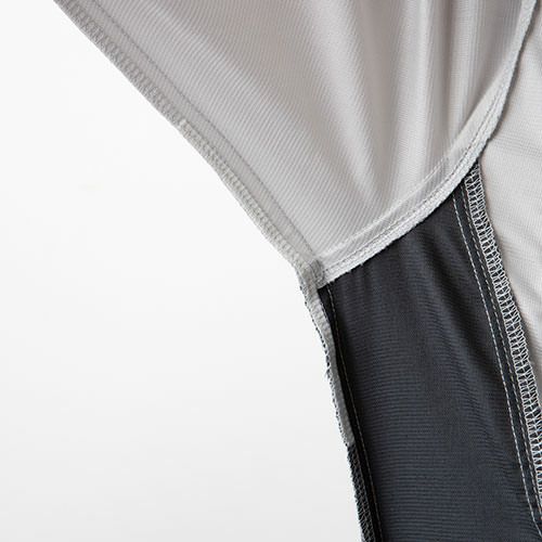 混率や番手の異なる特殊原綿を使った「校倉造り構造」で、高い通気性、優れた吸水・速乾性を実現した夏に最適な高機能素材ストレッチアゼックを採用。