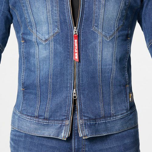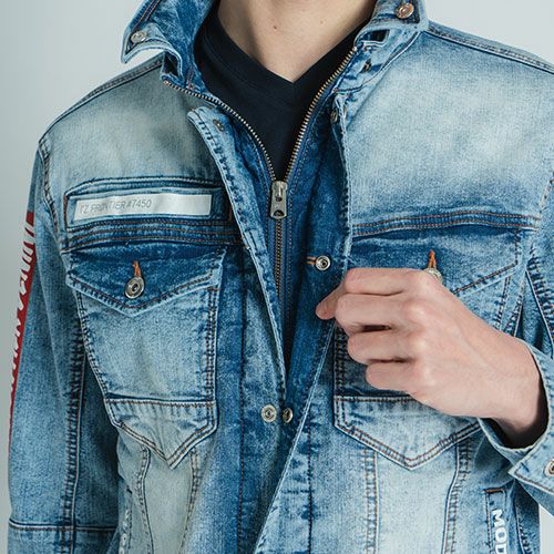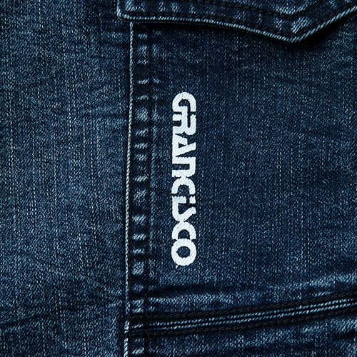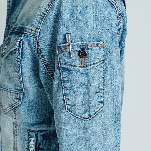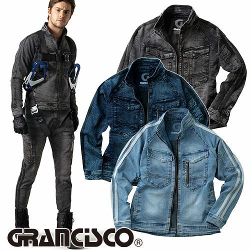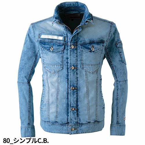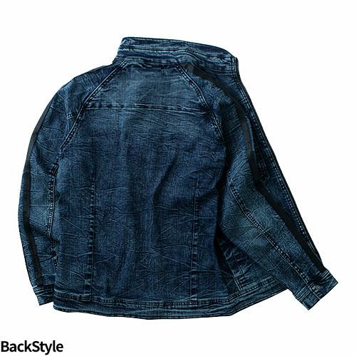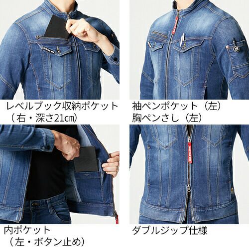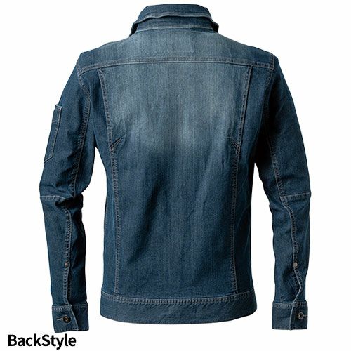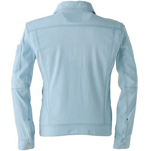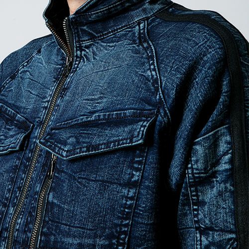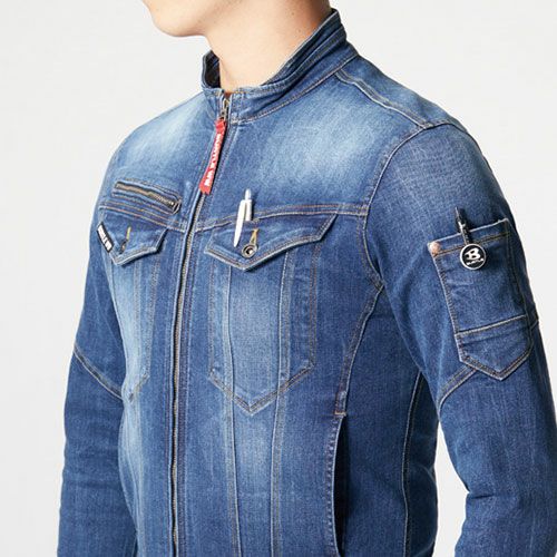 ライン入りスタイリッシュストレッチデニムが新登場! GCA800 ライン入りデニムジャケット。人気のデニムシリーズから、よりスタイリッシュに進化した800シリーズのライン入りデニムジャケット。 本来のジーンズの持つファッション性と機能性ををあわせもった、ワーカーをスタイリッシュに演出するコンテンツに仕上がりました。ジーンズメーカーの得意技術のひとつでもある「洗い加工」を手作業でたくみに施し、見た目は綿100%のような表情なのに驚異的な伸縮性。 細身に仕立てたシルエットでスリムなスタイルをキープしつつ、そのストレッチ性で着心地は想像以上に快適です。やや小ぶりな襟に仕立てることで、ジッパーを上げて立ち襟にしても開襟にして襟を寝かせても、野暮ったくならず、多種なツールを格納できる携帯力の高いポケットを搭載するなど、 細かいところまで気を利かせた、粋なデニムジャケットに仕上げています。同シリーズのデニムカーゴとのコーディネートで、一目置かれるワークスタイルを。