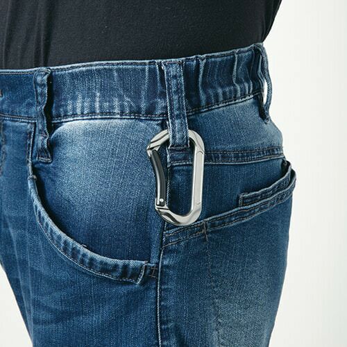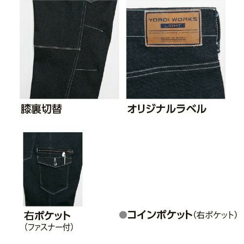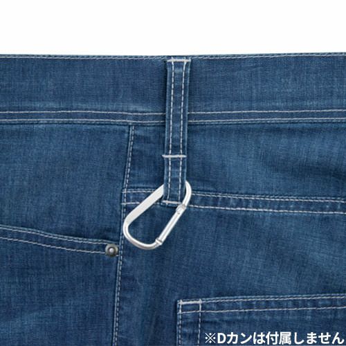接触冷感で涼感を演出カッコよさと心地よさを両立したユーズド感のあるデニムワークウェア7.3オンス薄手デニム素材に鉱物練り込みナイロン糸を混紡し熱を発散ポリウレタンのストレッチ性も健在 ●右前カラビナループ仕様●ウォッチポケット●膝タック入り立体縫製●右側にワンポイントのロゴプリント●裾フライス仕様