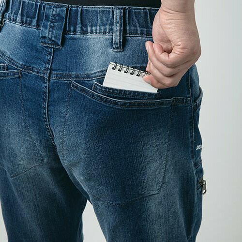 スリムシルエットで裾がスッキリし動きやすいジョガーパンツ ・コットン100%のデニムに比べて4倍以上の耐摩耗性を実現・高密度ナイロン66を混紡した織物・オーセンティックなデニムの見た目と手触り・ミリタリーユニフォームから開発された技術