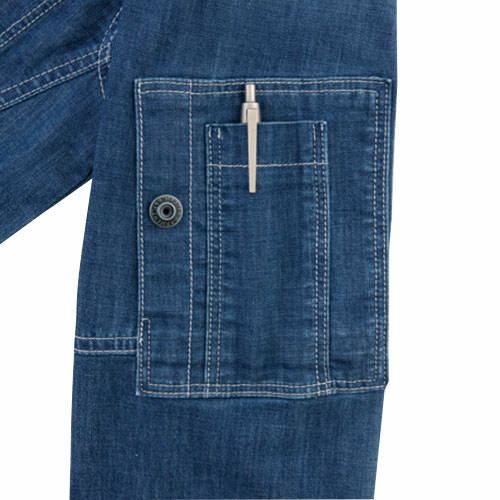 ストレッチデニムサマータイプが登場。吸汗性、吸湿性の高い特殊な糸を織り込み、汗を素早く吸収蒸発。気化熱による冷感性を持たせた夏の現場に最適な現場服。グレーステッチや右胸のマットファスナーがアクセントに ●ヒンヤリ冷感ストレッチデニム●超伸びストレッチ素材●程よくフィットするスリムシルエット●バイオウォッシュとブラスト加工でこなれた風合い