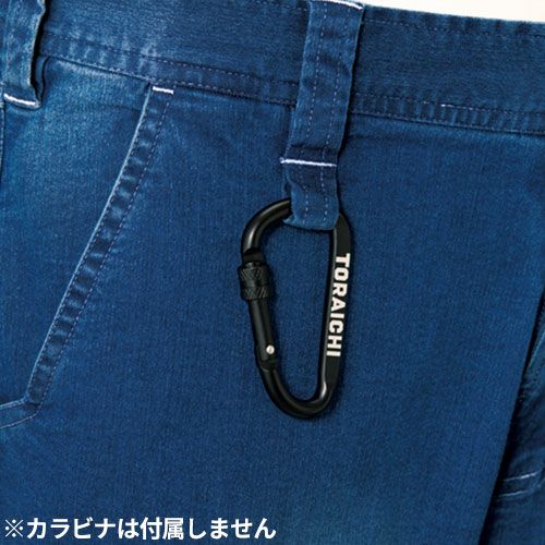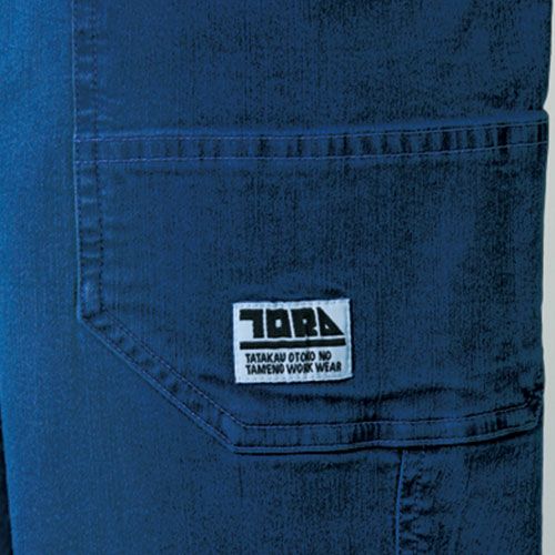 接触冷感で涼感を演出カッコよさと心地よさを両立したユーズド感のあるデニムワークウェア7.3オンス薄手デニム素材に鉱物練り込みナイロン糸を混紡し熱を発散ポリウレタンのストレッチ性も健在 ●膝部分にタック入り●モバイルポケット●右前カラビナループ仕様●左前脇にワンポイントのTORA-プリント●7.3ozの薄手ストレッチデニム