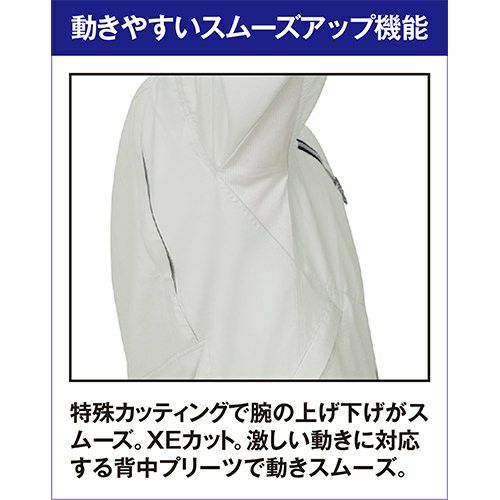 非対称デザインの胸ポケットがオシャレ度をアップ。通気性の良い校倉造り構造素材+脇下メッシュ素材で軽快に。脇下に施した特殊カッティングが背中のプリーツと連動して滑らかな腕の動きをサポートするスムーズアップ機能装着。土木・建築から運送・工場と幅広い職場に対応します。