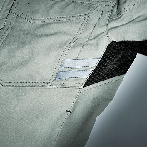 胸部分には用途に合わせて4つの多機能ポケット採用、左胸ペン差し、左胸ポケット、左胸反射テープ、肩&左右袖反射パイピング、左右後ろ肩部分に反射素材、裾調整ボタン、背ノーフォーク、リラックスカット、脇メッシュ