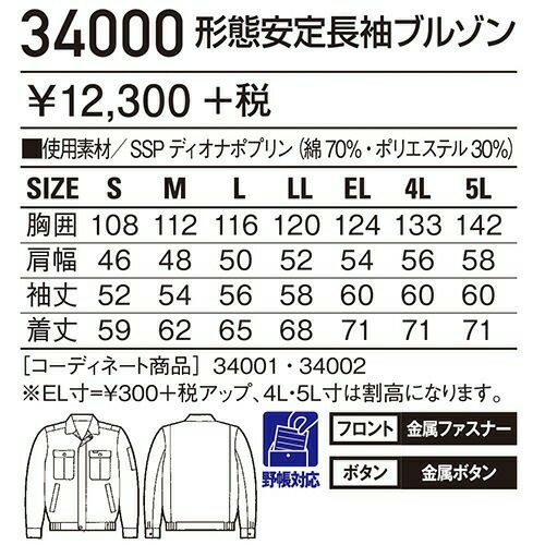 自重堂 DESK-WJ 作業服 34000 長袖ブルゾン 春夏 メンズ 作業着 ワークウエア ブルゾン