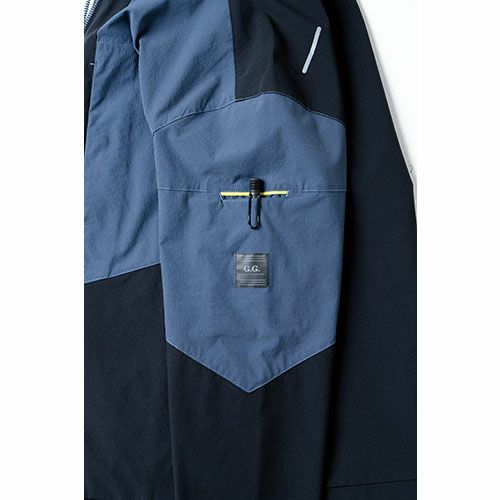 樹脂ドットボタン(隠し)/ファスナー/冷感素材/袖ペン差し/反射ロゴプリント/反射プリント/ロゴ入りラインテープ/胸ファスナーポケット(長財布が入る)/胸ポケット(野帳が入る)/隠しドットボタン/デオドラントテープ/反射ネーム