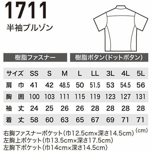 作業服 ブルゾン ジーベック XEBEC TCストレッチ半袖ブルゾン 1711 作業着 春夏 ストレッチ 帯電防止