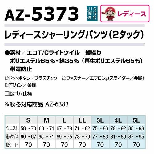 他の画像を見る アイトス AZ-5363 レディースシャーリングパンツ(2タック ツータック) AITOZ 作業服 作業着 ボトムス パンツ ズボン レディース 女性用 春夏 帯電防止 涼しい 特別価格 ¥ 3,660 税込 〜 特別価格 ¥ 税込 幅広い分野に対応するエコマーク認定、レディースワークウェア。 詳細を見る お気に入りに登録する