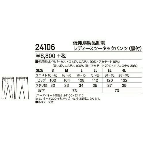 他の画像を見る 自重堂 DESK 作業服 24106 レディスツータック 春夏 レディース 作業着 ボトムス ワークウエア レディースパンツ 特別価格 ¥ 5,511 税込 〜 特別価格 ¥ 税込 チリやホコリを嫌う職場に低発塵ユニフォーム。 低発塵性と肌触りの良さを追求した二重織り素材「リバーセル」を使用。 毛羽が発生しにくいポリエステル長繊維を使用することで低発塵性に優れ、 またウォッシュ&ケアにも富んでいます。 詳細を見る お気に入りに登録する