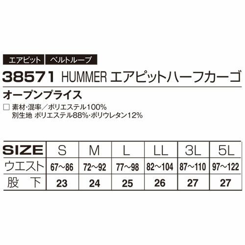 他の画像を見る 作業服 ハーフパンツ HUMMER ハマー エアピットハーフカーゴ 38571 作業着 春夏 カジュアル アウトドア タウンユース スポーツ レジャー カッコいい おしゃれ 涼しい 特別価格 ¥ 2,949 税込 通気性、吸汗速乾性を兼ね備えた軽量のAIR PITを採用 生地全体に配された通機孔が通気性を高め衣服内を快適に保つ作業時などの汗をかくアクティブシーンにはもちろん、日常のリラックスシーンにももってこいのカーゴパンツ 在庫切れ 詳細を見る お気に入りに登録する