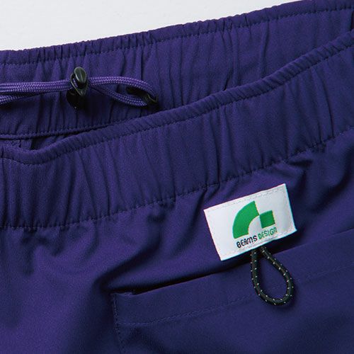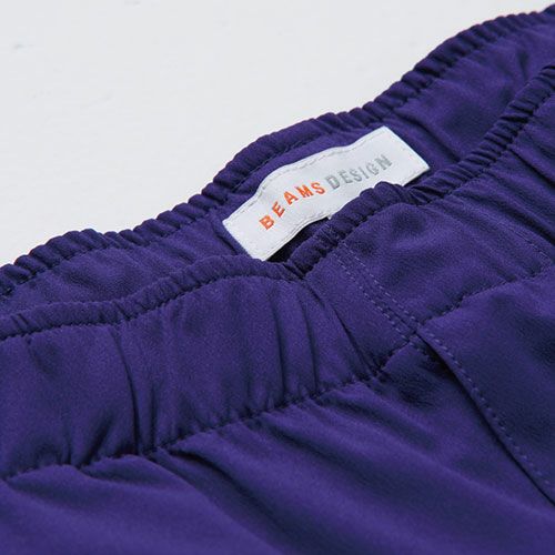 フロントサイドはファスナーポケットとオープンポケットのダブルポケット仕様になっていてファスナーポケットには大事なものを収納しつつオープンポケットからはハンカチなどがサッと取り出せる便利なディテールが特徴です。ウエストは総ゴム+スピンドルでよりウエストにフィットする仕様です。