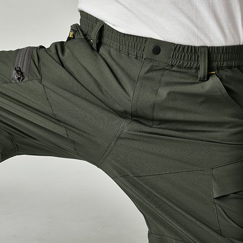 4WAYストレッチで快適な動きを実現 接触冷感生地を冷感ナイロンニット素材で切り替えることにより着衣中のストレス開放を実現したハイブリッドカーゴパンツWの伸びとWの冷感を体感できるデイリーパートナーカーゴ