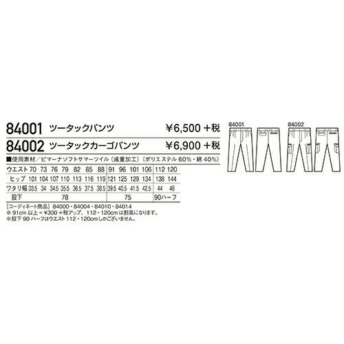自重堂 作業服 84101 ツータックパンツ 春夏 メンズ 作業着 腿ポケット無 ボトムス ワークウエア スラックス