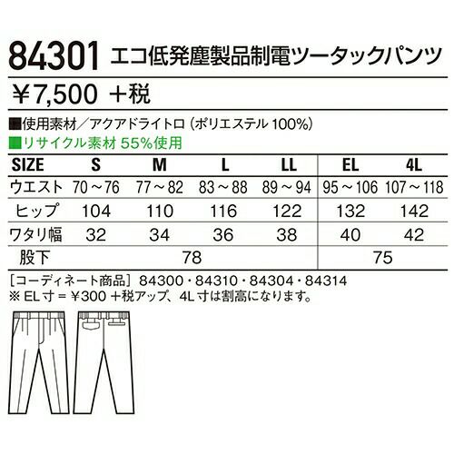 自重堂 作業服 84301 ツータックパンツ 春夏 メンズ 作業着 腿ポケット無 ボトムス ワークウエア スラックス