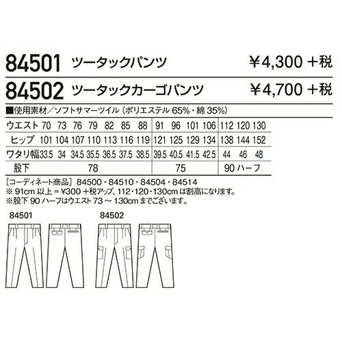 自重堂 作業服 84501 ツータックパンツ 春夏 メンズ 作業着 腿ポケット無 ボトムス ワークウエア スラックス