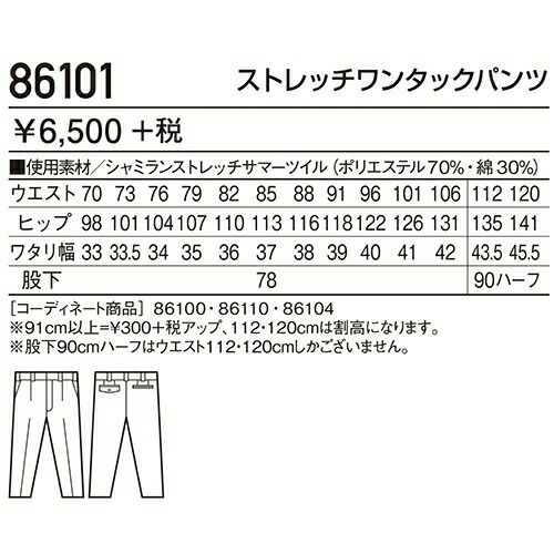 自重堂 作業服 86101 ワンタックパンツ 春夏 メンズ 作業着 腿ポケット無 ボトムス ワークウエア スラックス