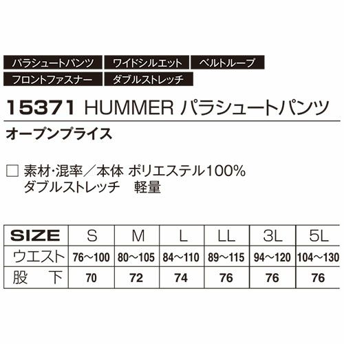 作業服 カーゴパンツ HUMMER ハマー パラシュートカーゴ 15371 作業着 春夏 カジュアル アウトドア タウンユース スポーツ レジャー カッコいい おしゃれ 涼しい