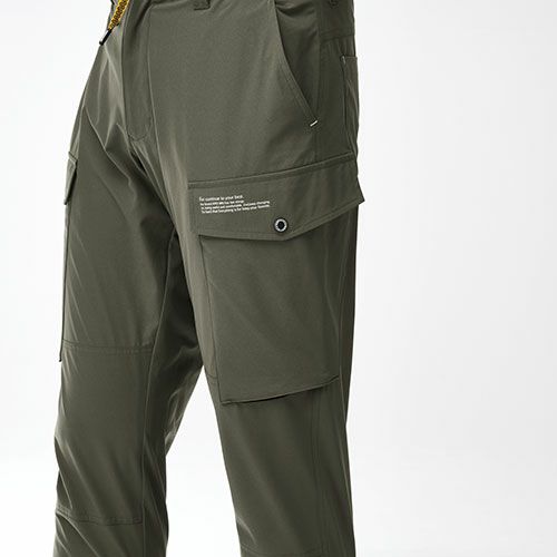 高機能・品質で軽量化に配慮したカーゴジョガーパンツポリウレタンを使用しない捲縮糸ストレッチ素材で軽く薄手ながら耐久性を両立 ●ストレッチ(捲縮糸使用)●収納ポケットは前面4つ、後面3つ●オリジナルロゴ付きポケット(左サイド)YKKビスロンファスナー(※スライダー部はメタル)●軽量の強化プラスティックのドット釦を使用●右腰サイドにブランドネーム●軽撥水●膝部分は立体シルエット●足首後ろ半分ハーフリーブ仕様