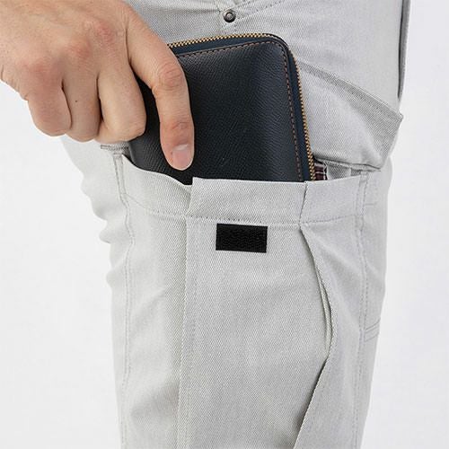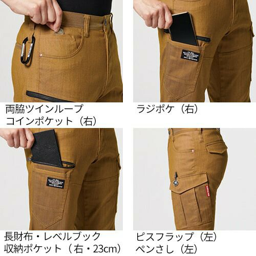 ライン入りスタイリッシュストレッチデニムが新登場! GCA812 デニムカーゴ老舗デニムメーカーでもあるタカヤ商事が得意とする「デニム」コンテンツ。タカヤワークウェア事業部でもその強みを最大限に活かしたデニムワークウェアが満を持して登場。 ジーンズの持つファッション性と機能性ををあわせもった、ワーカーをスタイリッシュに演出するデニムシリーズ。ジーンズメーカーの得意技術のひとつでもある「洗い加工」を手作業でたくみに施し、見た目は綿100%のような表情なのに驚異的な伸縮性。細身に仕立てたシルエットでシャープなスタイルをキープしつつ、そのストレッチ性ではき心地は想像以上の快適さ。GCA712からシルエットをアップデートし、従来の着心地はそのままによりシャープなシルエットに仕上ました。