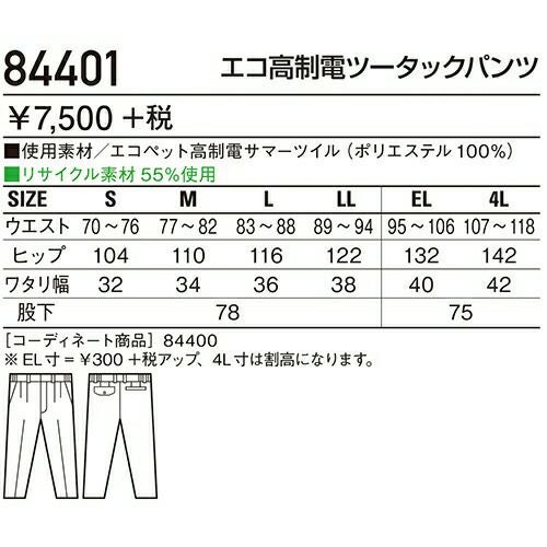 自重堂 作業服 84401 ツータックパンツ 春夏 メンズ 作業着 腿ポケット無 ボトムス ワークウエア スラックス