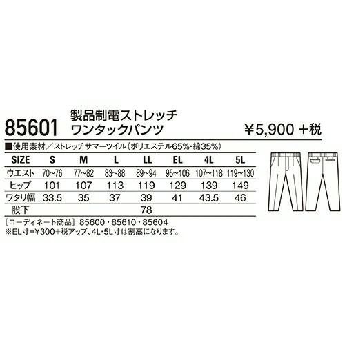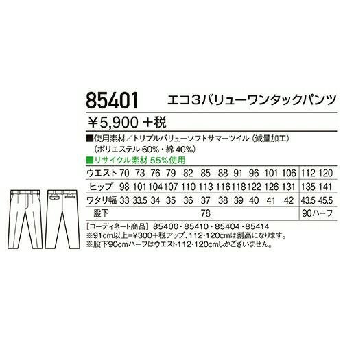 自重堂 作業服 85601 ワンタックパンツ 春夏 メンズ 作業着 腿ポケット無 ボトムス ワークウエア スラックス