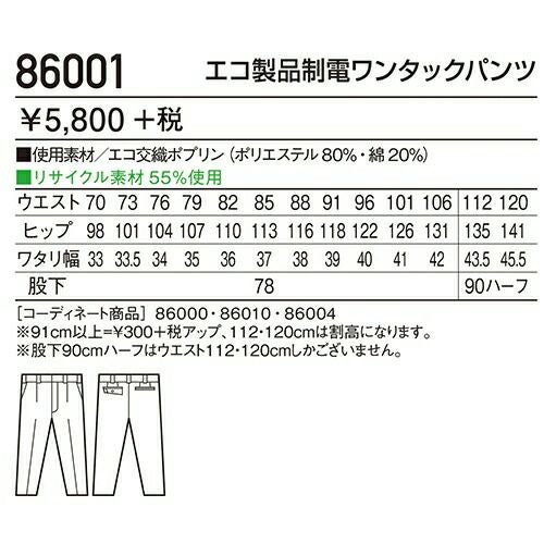 自重堂 作業服 86101 ワンタックパンツ 春夏 メンズ 作業着 腿ポケット無 ボトムス ワークウエア スラックス