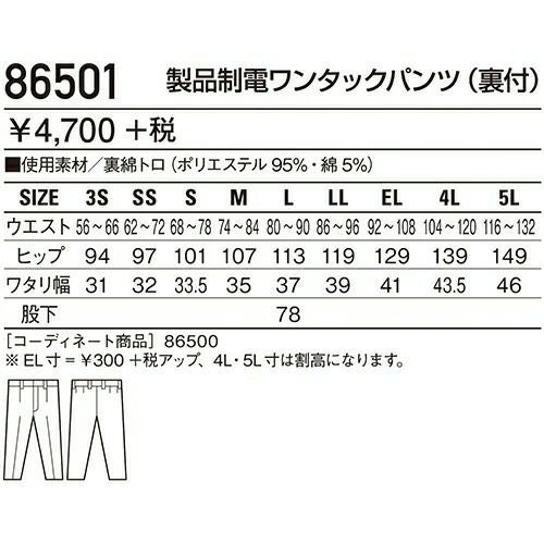 自重堂 作業服 86501 ワンタックパンツ 春夏 メンズ 作業着 腿ポケット無 ボトムス ワークウエア スラックス