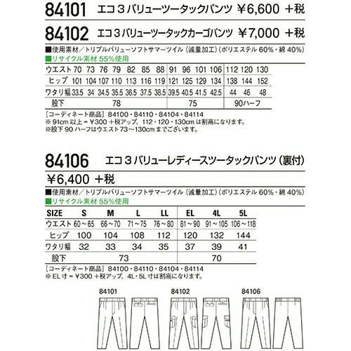 自重堂 作業服 84101 ツータックパンツ 春夏 メンズ 作業着 腿ポケット無 ボトムス ワークウエア スラックス