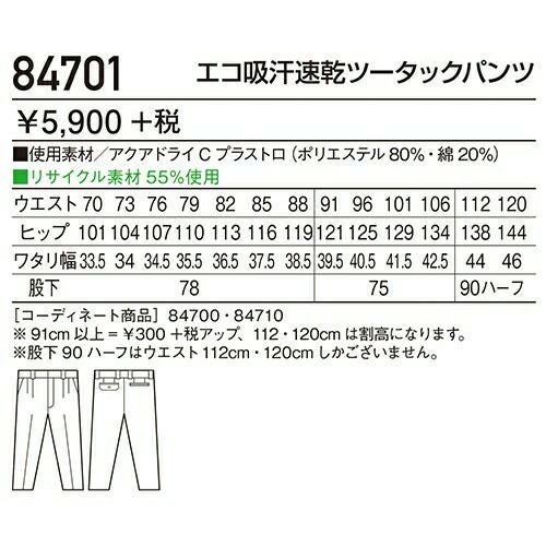 自重堂 作業服 84701 ツータックパンツ 春夏 メンズ 作業着 腿ポケット無 ボトムス ワークウエア スラックス