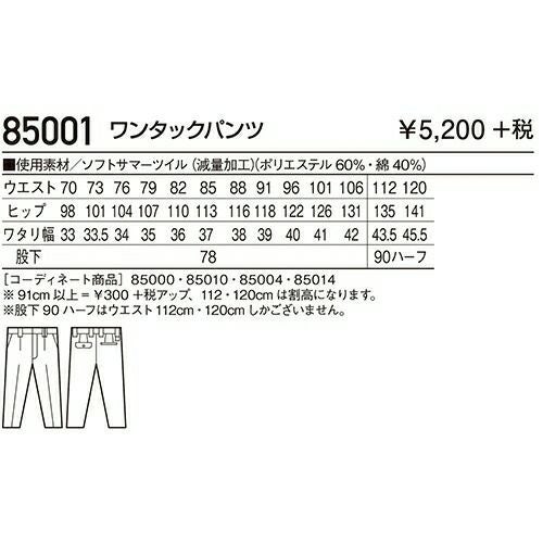 自重堂 作業服 85101 ワンタックパンツ 春夏 メンズ 作業着 腿ポケット無 ボトムス ワークウエア スラックス