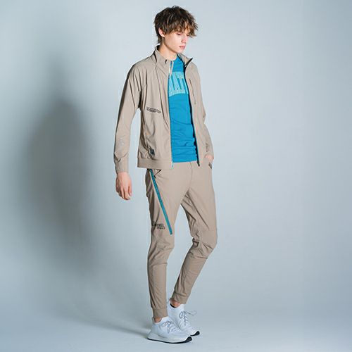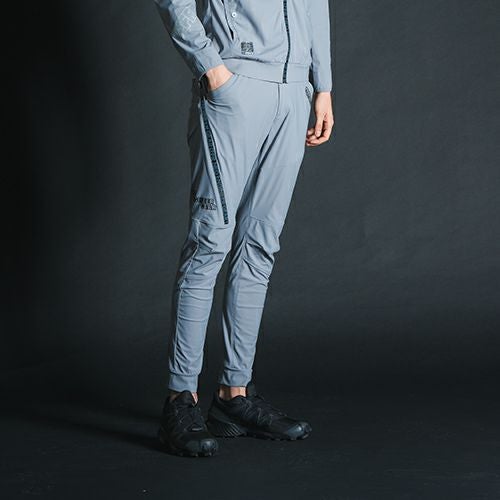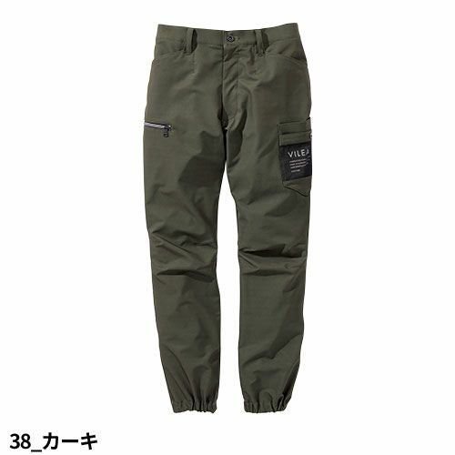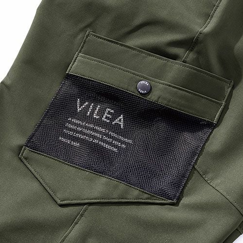 VILEAのジョガーパンツ。素材は加撚を強くしたジャガード織で裏に凹凸がありべたつかずスーパーストレッチで柔らかく強度もあります。機能は左脇ロゴ入りメッシュポケット。右脇YKKファスナー付ポケット。右後ろポケット下にロゴプリント。軽くて機能的なVILEAジョガーパンツ。