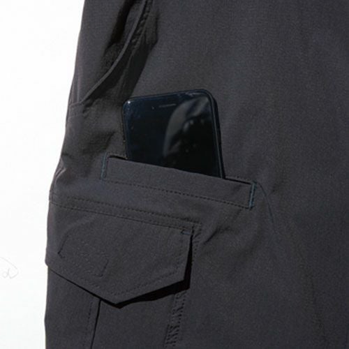 細かなギミックを随所に施した「FUBER ユーティリティーシリーズ」。マットな色合いで耐久性と軽量性を両立したタスランナイロンを使用。 膝上丈のユーティリティーショートパンツ。右サイドには落下防止と座った時に邪魔にならないボタン付きのスマホ用ポケットを搭載。ウエストにはカラビナやキーを吊れるミニループ付き。