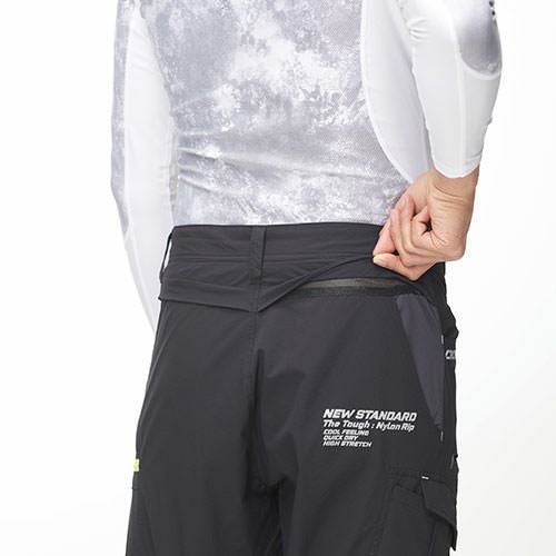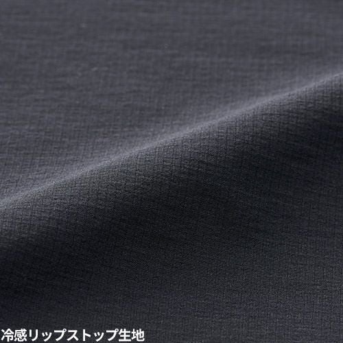 ドライタッチで冷感のあるナイロンリップストップ生地を使用したレイヤードハーフ膝から足先にかけてひんやりとしたニット素材を配置し異素材のクール感を演出