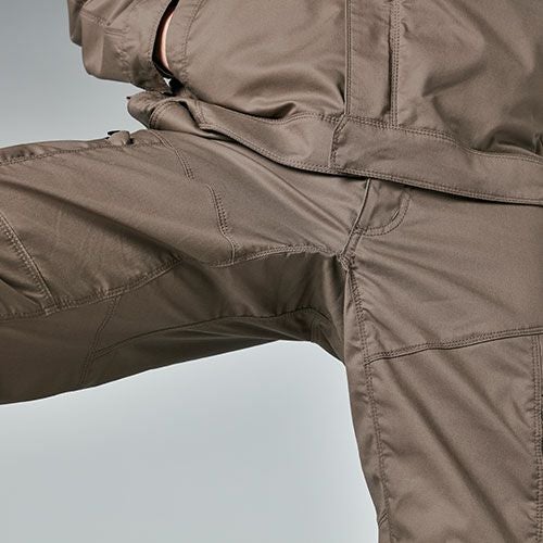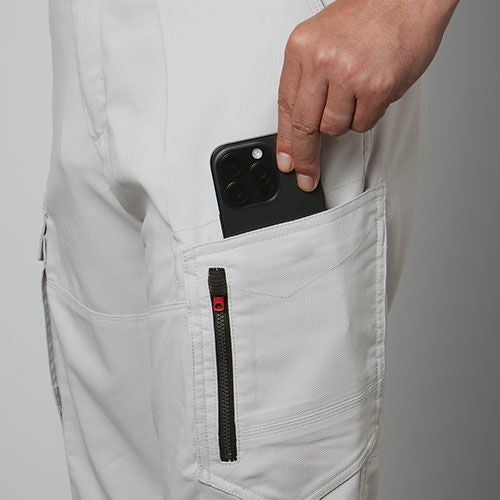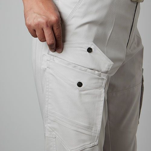 TSDESIGN独自開発素材の「TCNクロスツイル」を使用ナイロンによるしなやかさを持つ高強度カーゴパンツ TCNクロスツイル&TCNクロスリップポリエステル×綿の混紡糸に、ナイロンのしなやかさと耐摩耗性をプラスしたハードな現場に対応できる高強度素材。ストレッチ性(12%)、綿による着心地の良さとポリエステルによる強度を兼ね備えている。導電繊維を混入させており、静電気をケアする。