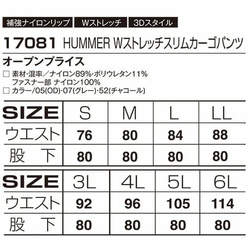 作業服 カーゴパンツ HUMMER ハマー Wストレッチスリムカーゴパンツ ストレッチ 17081 作業着 メンズ パンツ 春夏 軽量 作業ズボン 冷感 ドライ 伸縮 大きいサイズ 5L 6L ワークパンツ 作業用パンツ 作業用ズボン おしゃれ 人気 安い かっこいい おすすめ ワーク マン