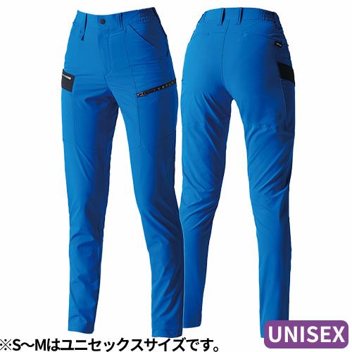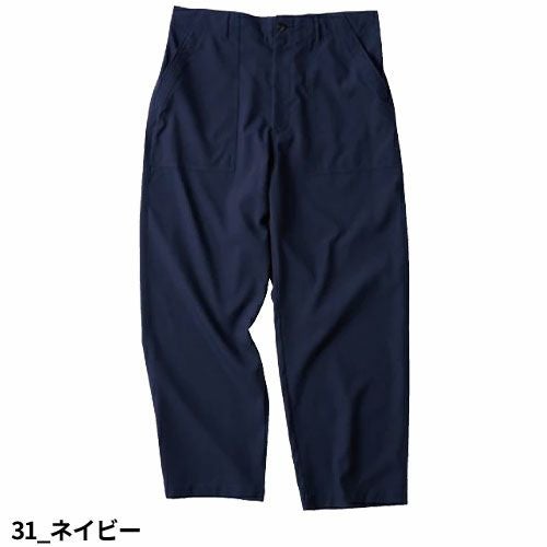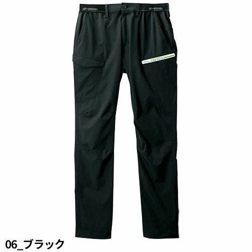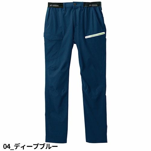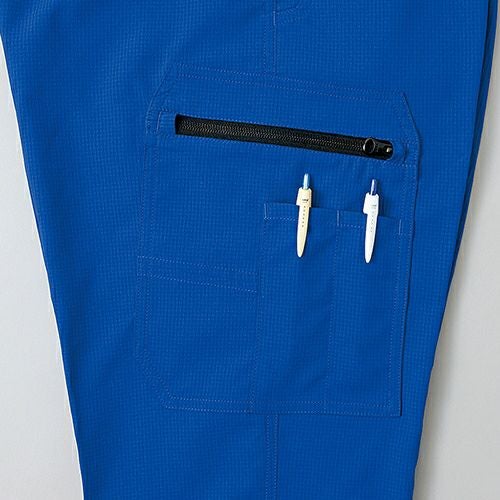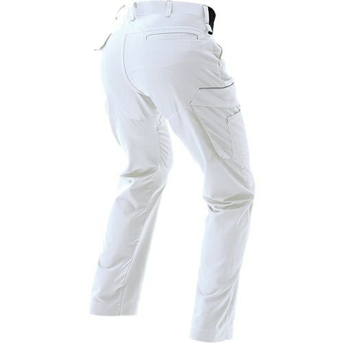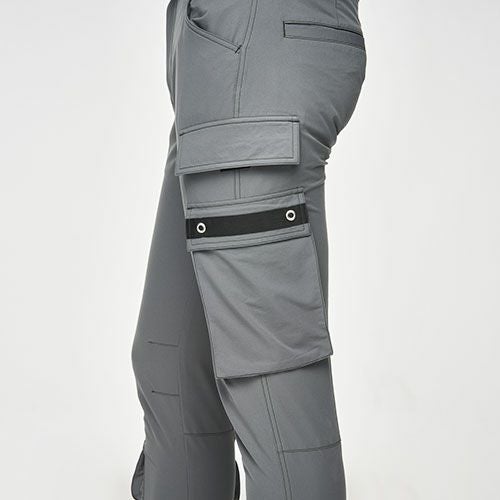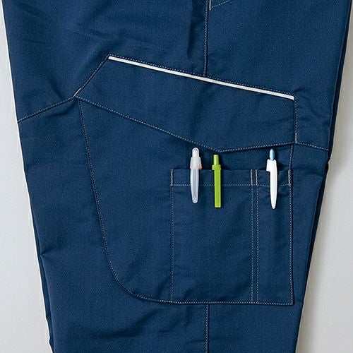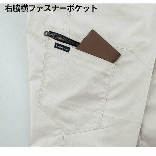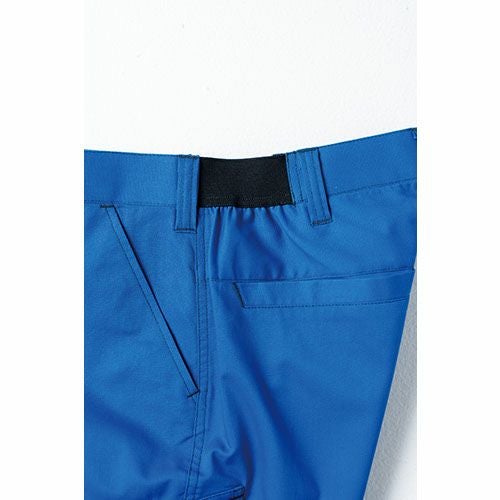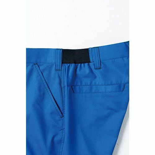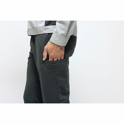 風が抜ける爽快新素材、超軽量スーパーストレッチ! 帯電防止機能にも優れたこちらの商品は、独自の繊維構造により、通気性抜群の軽量ストレッチ素材を採用しています。すっきりとしたシルエットを保つシンプルなカーゴポケットにはペン差しとファスナーポケットも施されています(右側ポケット)。サイドにゴムをはさみこみ、ウエストの動きにも柔軟に対応します。