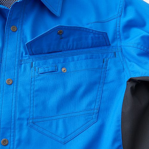 耐久ストレッチ素材でよりハードなワークシーンへ豊富な収納機能と新設計のEZラグランアームを採用し腕回りの動きやすさを実現 ■ワークシーンの定番、ポリエステルと綿の耐久ストレッチ素材■緯糸に特殊仮撚り技術による熱を加えるとバネのように伸縮性が生まれるクラボウ品質のバンジーテックサマーツイル■新設計のEZラグランアームで腕の動きをサポート、前後上下の動きに対し抜群の動きやすさとつっぱり感を軽減■ノーフォークと脇のメッシュベンチレーションが通気性を確保し衣服内の蒸れた空気を外に排出■豊富な収納ポケットと反射素材付き