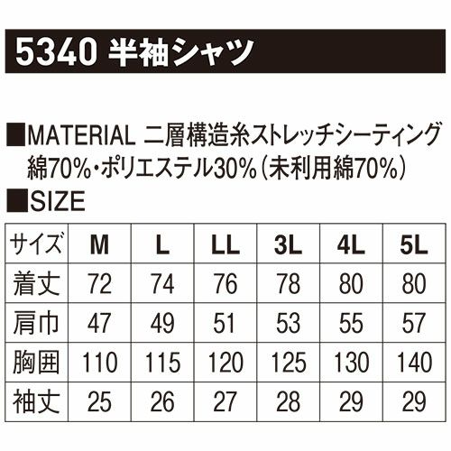 7. 作業服 半袖シャツ ホシ服装 半袖シャツ 5340 作業着 春夏 ストレッチ 二層構造糸