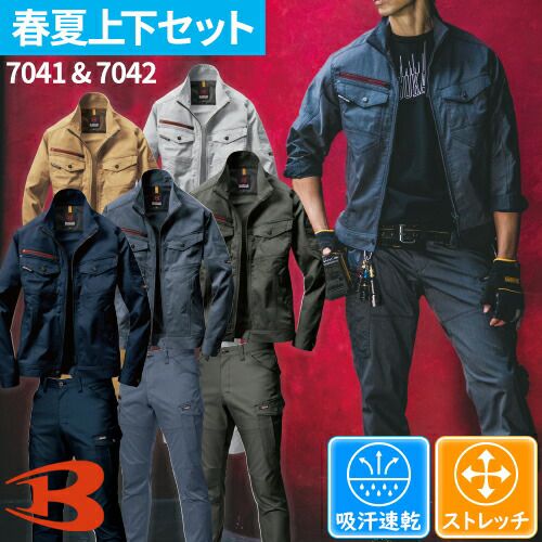 他の画像を見る 作業服 上下セット 春夏 夏用 涼しい 作業着 バートル BURTLE 7041 7042 パンツ ズボン 吸汗速乾 ストレッチ ジャケット メンズ レディース 長袖 セットアップ カーゴパンツ ジャンパー 大きいサイズ 人気 おしゃれ かっこいい ユニフォーム 特別価格 ¥ 8,200 税込 〜 特別価格 ¥ 税込 軽い!涼しい!動きやすい!とりあえず1セットは欲しい、王道ワークウェア。 劣化しにくい素材を使っているため、伸長率17%のストレッチ性が半永久的に続く!ストレスフリーな着用感とイージーケアを実現したオーセンティックユニフォームシリーズ程よく細身のモダンフィットなシルエットは企業ユニフォームを洗練されたムードにセンスアップバートルデザインを象徴するユーティリティ性の高いレッドファスナーがシンボリックに映える再生糸を用いたエコロジカルなSDGs対応モデルで環境にも優しい 詳細を見る お気に入りに登録する