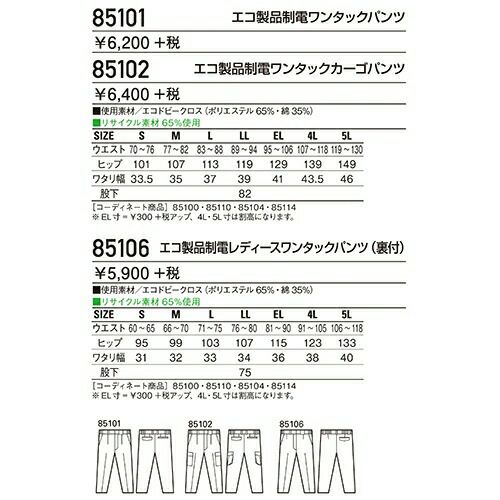 自重堂 作業服 85101 ワンタックパンツ 春夏 メンズ 作業着 腿ポケット無 ボトムス ワークウエア スラックス