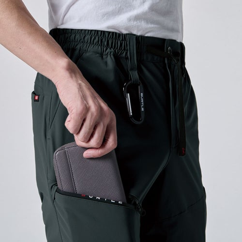 ハードユースに適した高耐久ストレッチCORDURA素材をモノトーンなデザインにまとめて都会的なワークウェアの雰囲気に ・耐久性と自在に伸縮する4WAYストレッチの特性を有するハードユースに最適なコーデュラ素材を使用・吸汗速乾、UVカット、接触冷感の機能を併せ持つコーデュラナイロン素材・細身のテーパードシルエットが抜群のフィット感を提供する・男女ユニセックスの着用に対応